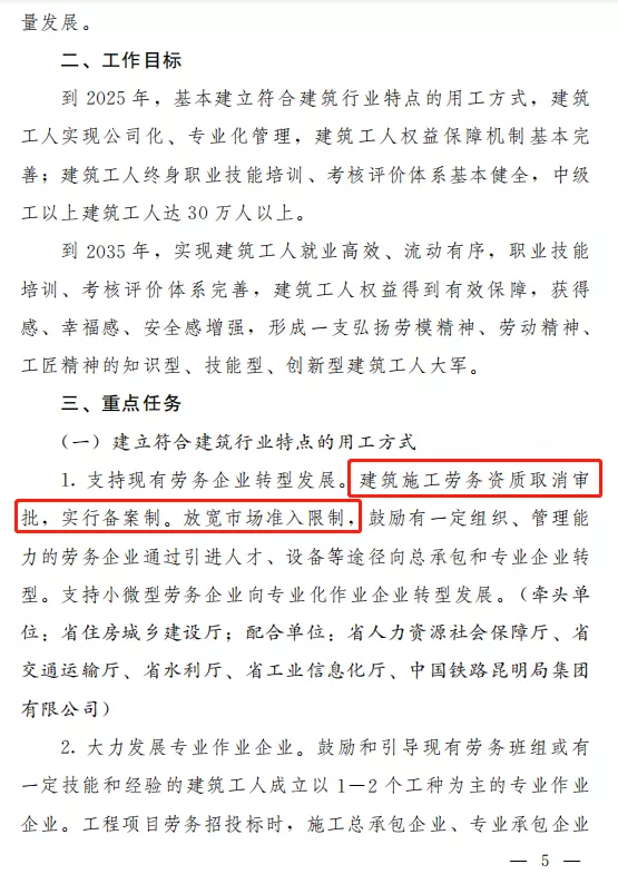 建築施工(gōng)勞務資(zī)質取消審批,實行備案制。放寬市場準入限制,鼓勵勞務企業向總承包和專業企業轉型。